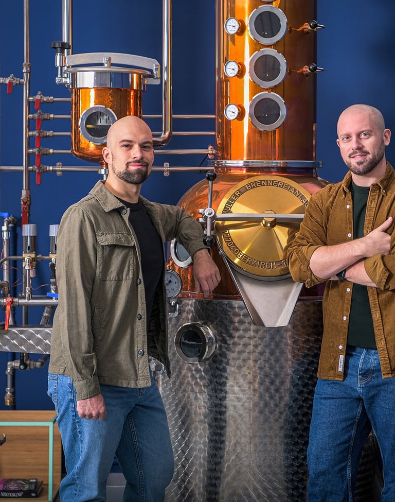 Tornato in Italia, durante la pausa forzata della pandemia, si dedica allo studio intensivo del mondo degli spirits artigianali. Spinto dalla passione e dal supporto degli amici, avvia il percorso per fondare la sua distilleria. Dopo un anno di ricerca della location perfetta e delle pratiche burocratiche, ordina il suo primo alambicco: l’Aromat 230, soprannominato affettuosamente Percival, realizzato dalla storica famiglia Müller Brennereianlagen, artigiani costruttori di alambicchi dal 1929.